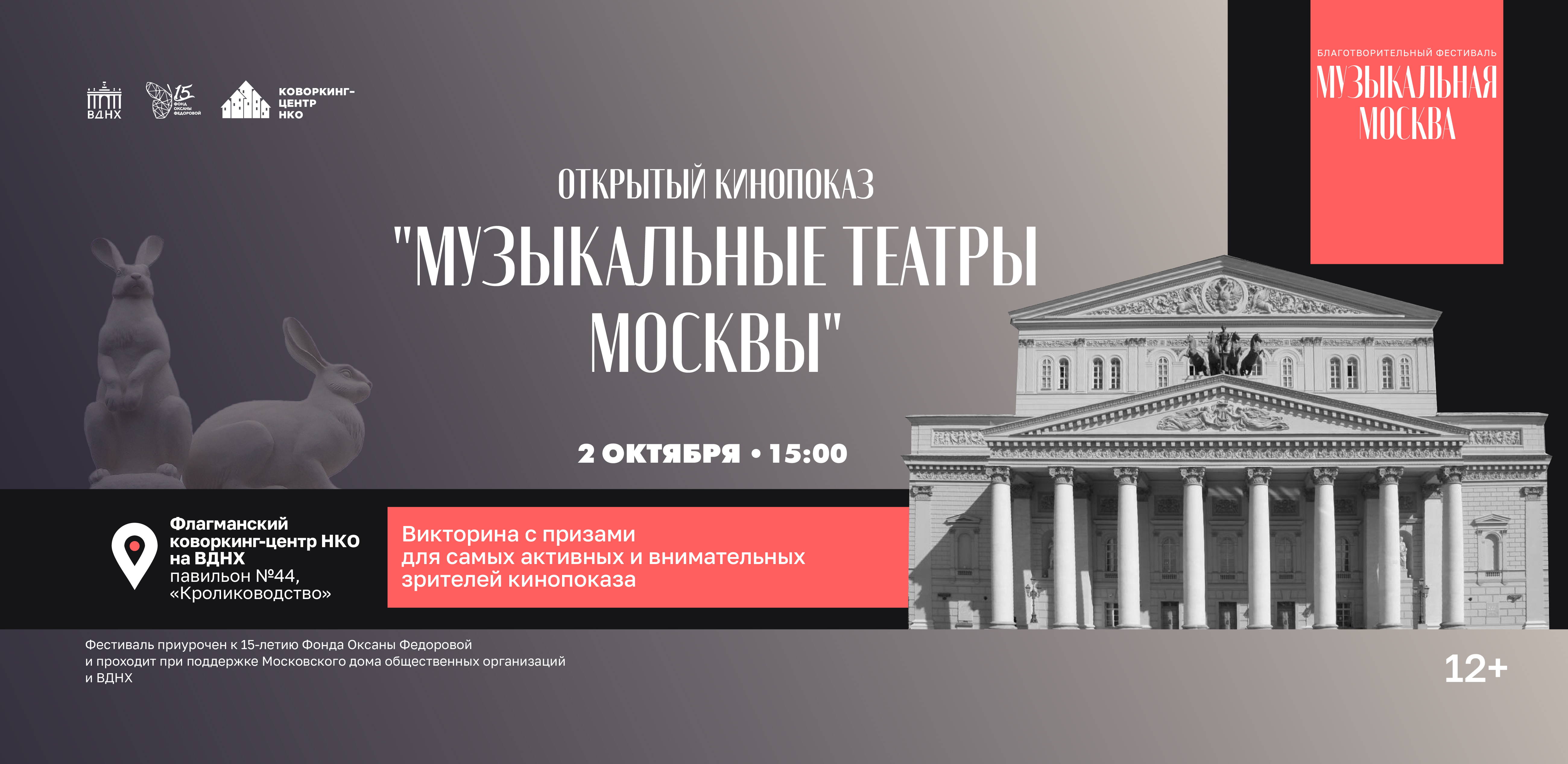2 октября в 15.00 в рамках благотворительного фестиваля «Музыкальная Москва» на ВДНХ состоится открытый кинопоказ телефильма "Музыкальные театры Москвы", входящего в телепроект "Моя Россия: музыкальное путешествие", ведущей и режиссером которого выступила президент благотворительного фонда, Мисс Вселенная, заслуженная артистка России Оксана Федорова.