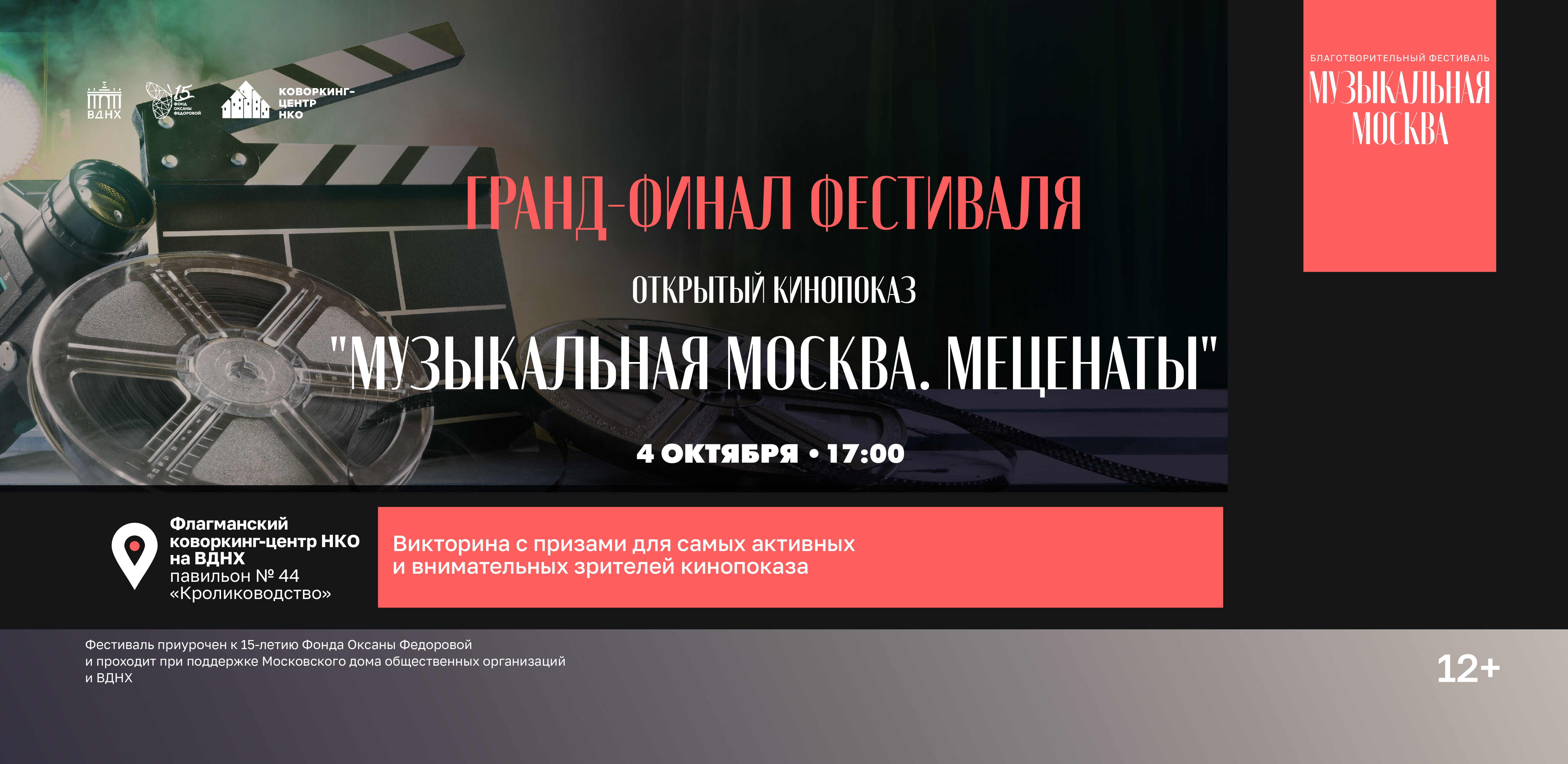 4 октября в 17.00 в рамках закрытия благотворительного фестиваля «Музыкальная Москва» на ВДНХ состоится открытый кинопоказ телефильма "Музыкальная Москва. Меценаты", входящего в телепроект "Моя Россия: музыкальное путешествие", ведущей и режиссером которого выступила президент благотворительного фонда, Мисс Вселенная, заслуженная артистка России Оксана Федорова.